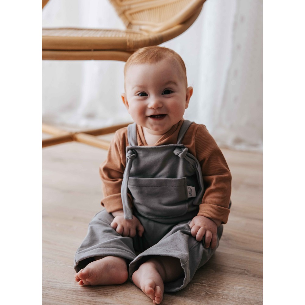 Salopette Unisex in caldo cotone bio leggermente felpato all'interno, con bretelle che passano su due asole davanti e allacciano con nodo, permettendo alla salopette di seguire l'altezza della bimba/o durante la crescita.